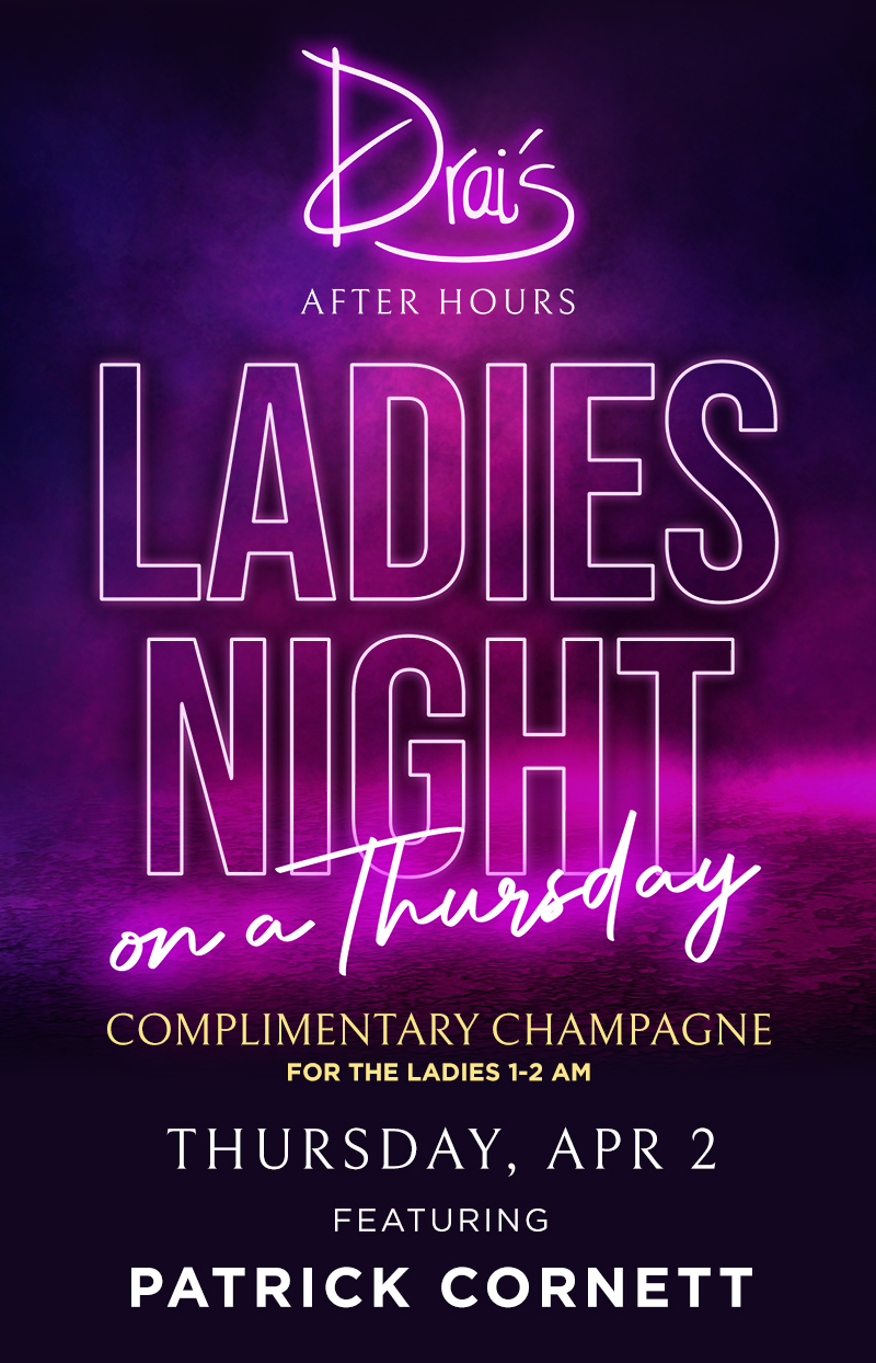 Join us Thursday for a night of music, dancing, and late-night energy. Ladies receive complimentary champagne from 1–2 AM.
