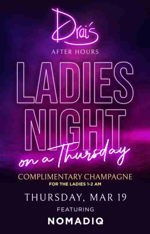 Join us Thursday for a night of music, dancing, and late-night energy. Ladies receive complimentary champagne from 1–2 AM.