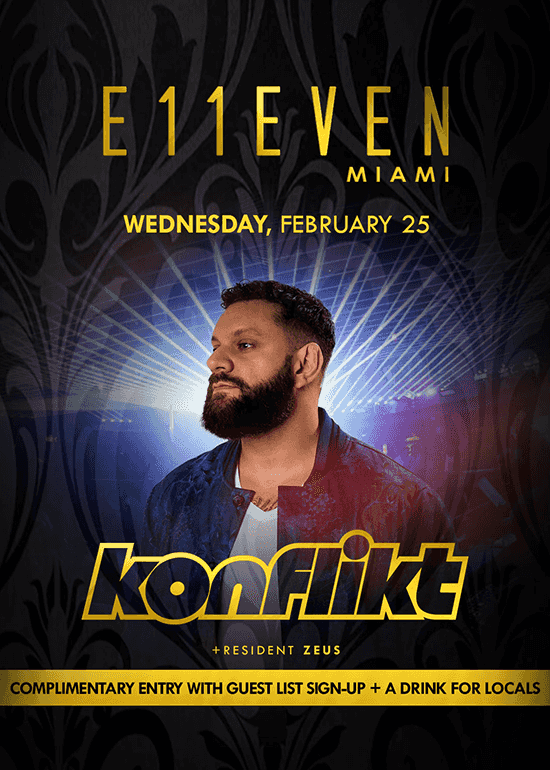 Konflikt at E11EVEN Wednesday, February 25. Complimentary Entry with Guest List Signup + FL locals receive a drink.