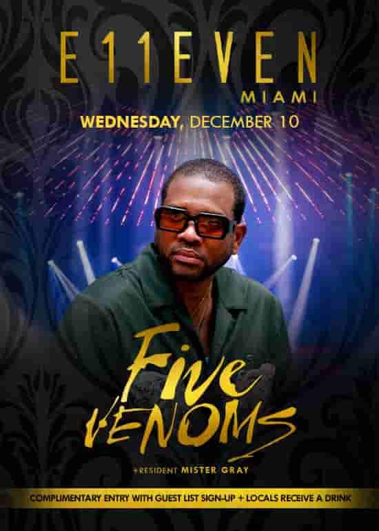 Five Venoms at E11EVEN Wednesday, December 10. Complimentary Entry with Guest List Signup + locals receive a drink.