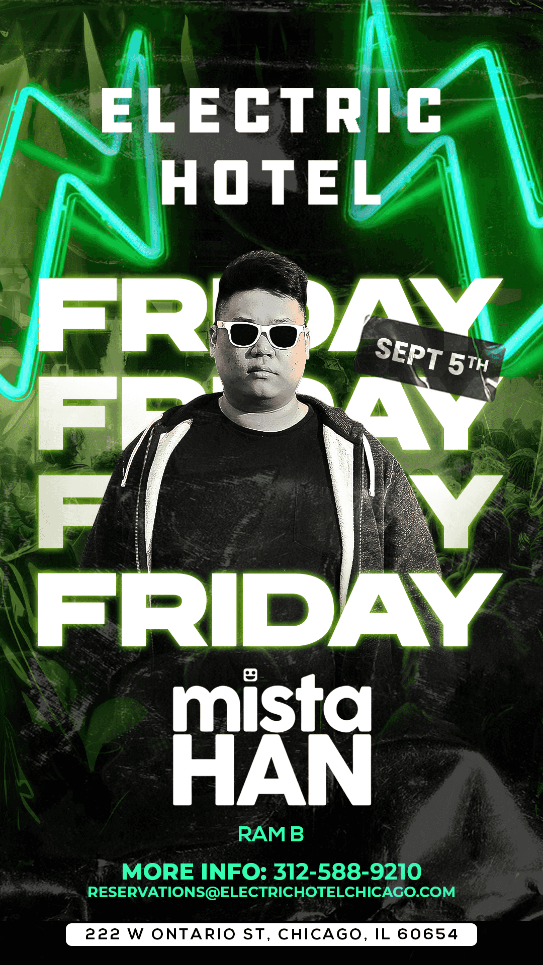 Get ready for an electrifying night at Electric Hotel, Chicago’s premier nightlife destination! Join us for an unforgettable evening of open-format music, where Chicago's top local DJ, Mista Han: will spin a dynamic mix of genres. Expect everything from House and Hip Hop to chart-topping Top 40, Latin hits, Rock anthems, Country singalongs, throwback classics, and more.