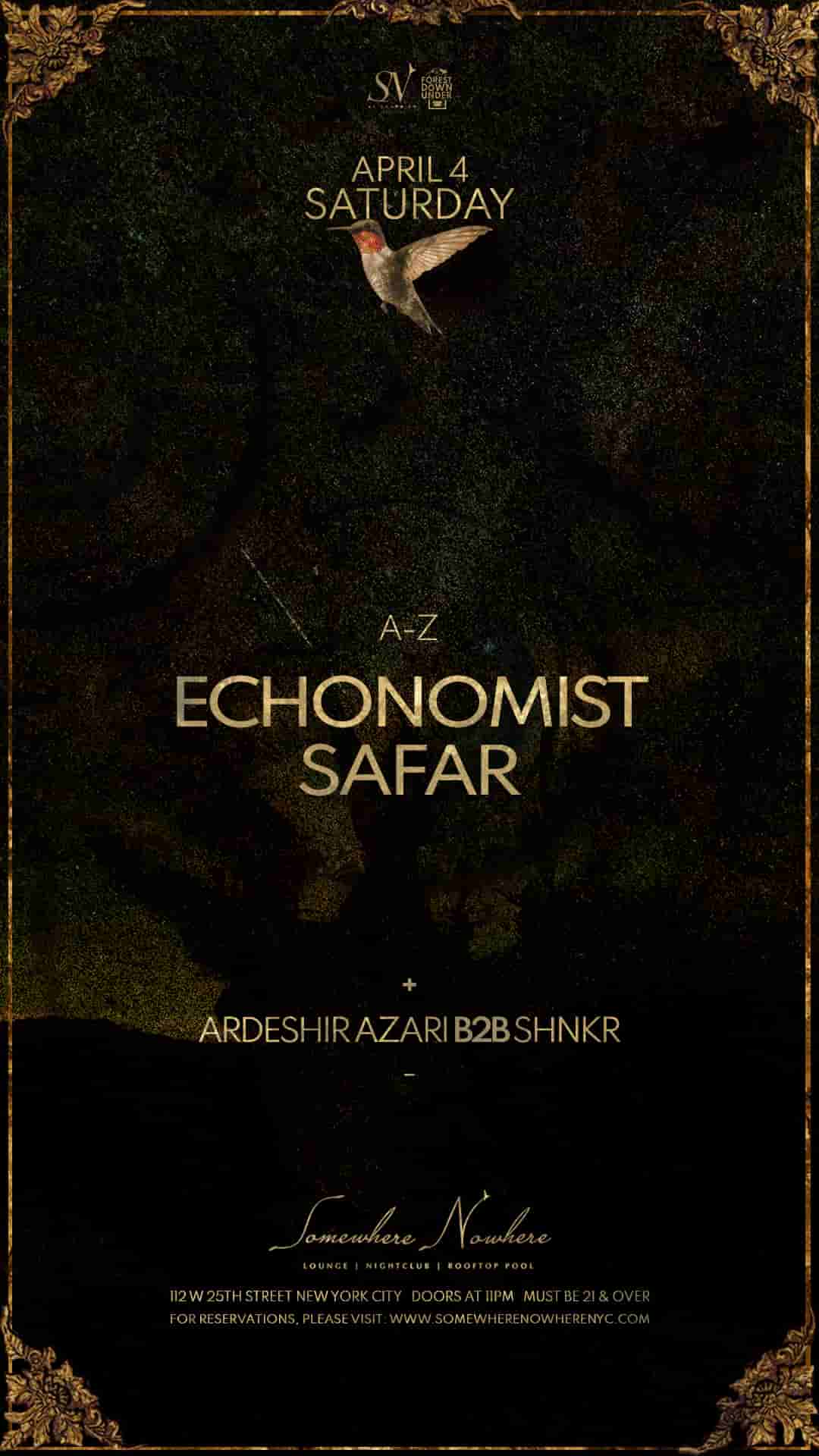 On Saturday, April 4th, Somewhere Nowhere NYC presents a musical journey by Echonomist, Safar and Ardeshir Azari B2B Shnkr.