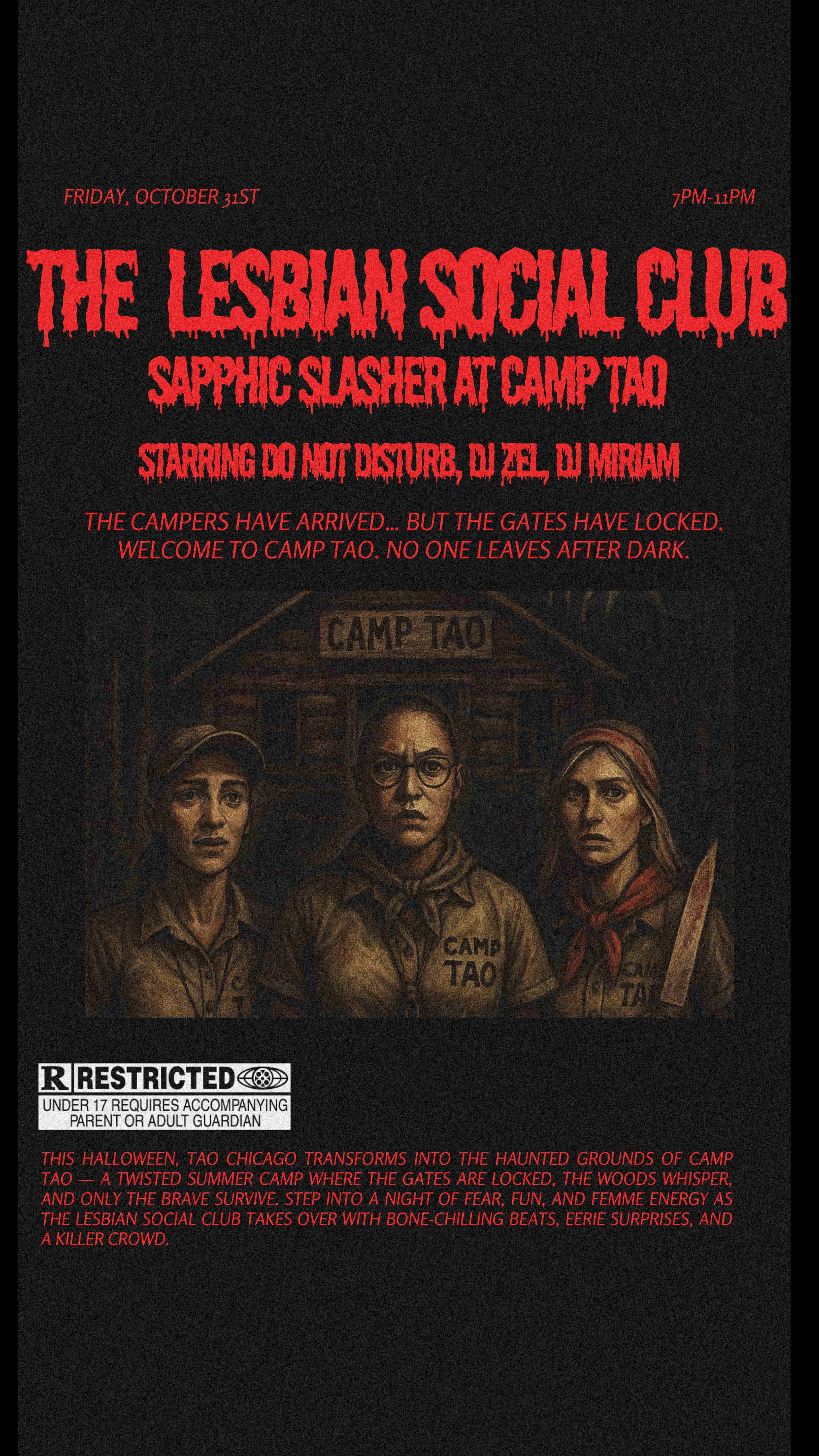 This Halloween, Tao Chicago transforms into the haunted grounds of Camp Tao — a twisted summer camp where the gates are locked, the woods whisper, and only the brave survive. Step into a night of fear, fun, and femme energy as The Lesbian Social Club takes over with bone-chilling beats, eerie surprises, and a killer crowd.
