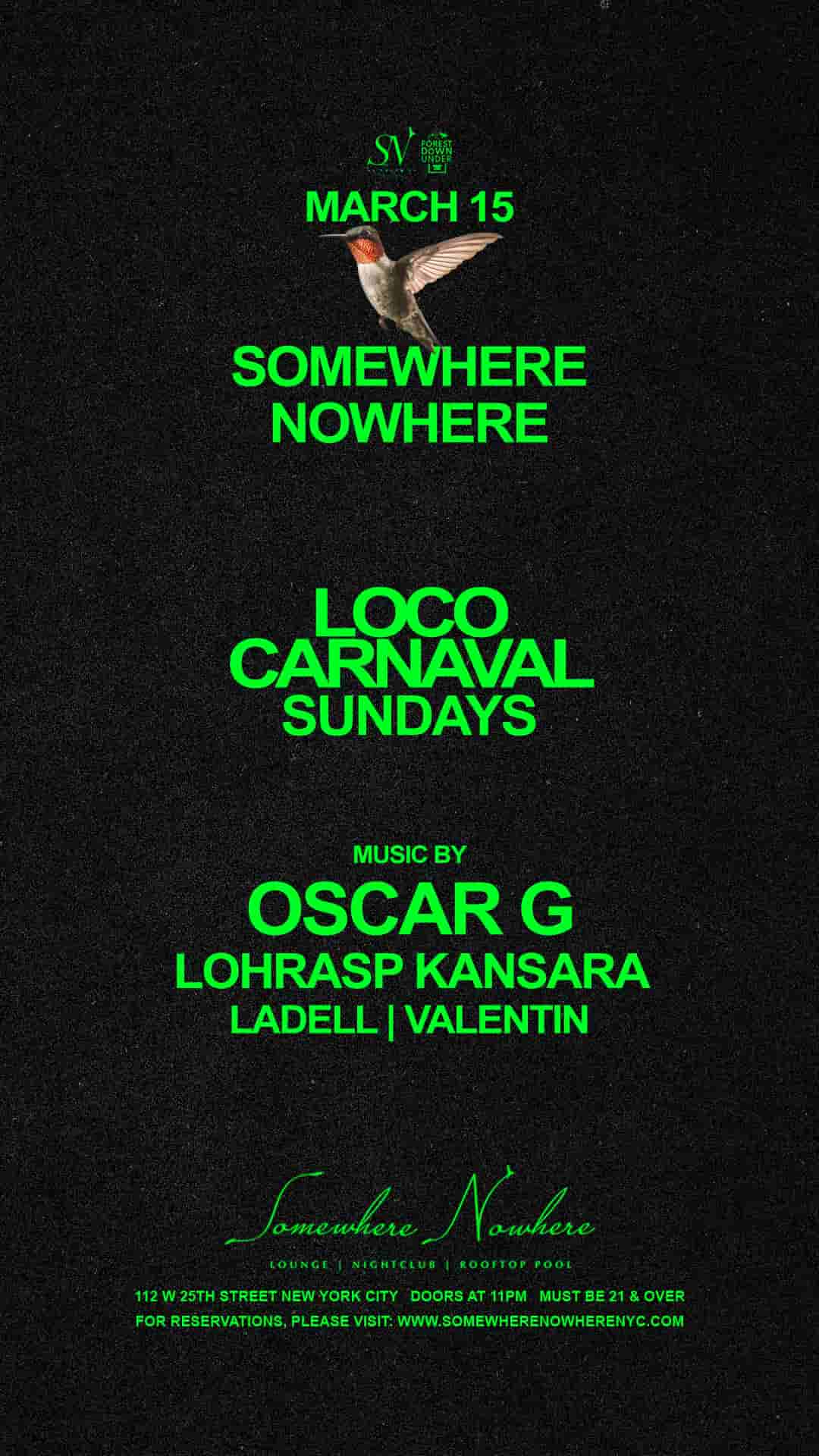 On Sunday, March 15th, Forest Döwn Under presents Loco Carnaval Sundays with music by Oscar G, Lohrasp Kansara, Ladell and Valentin at Somewhere Nowhere NYC.