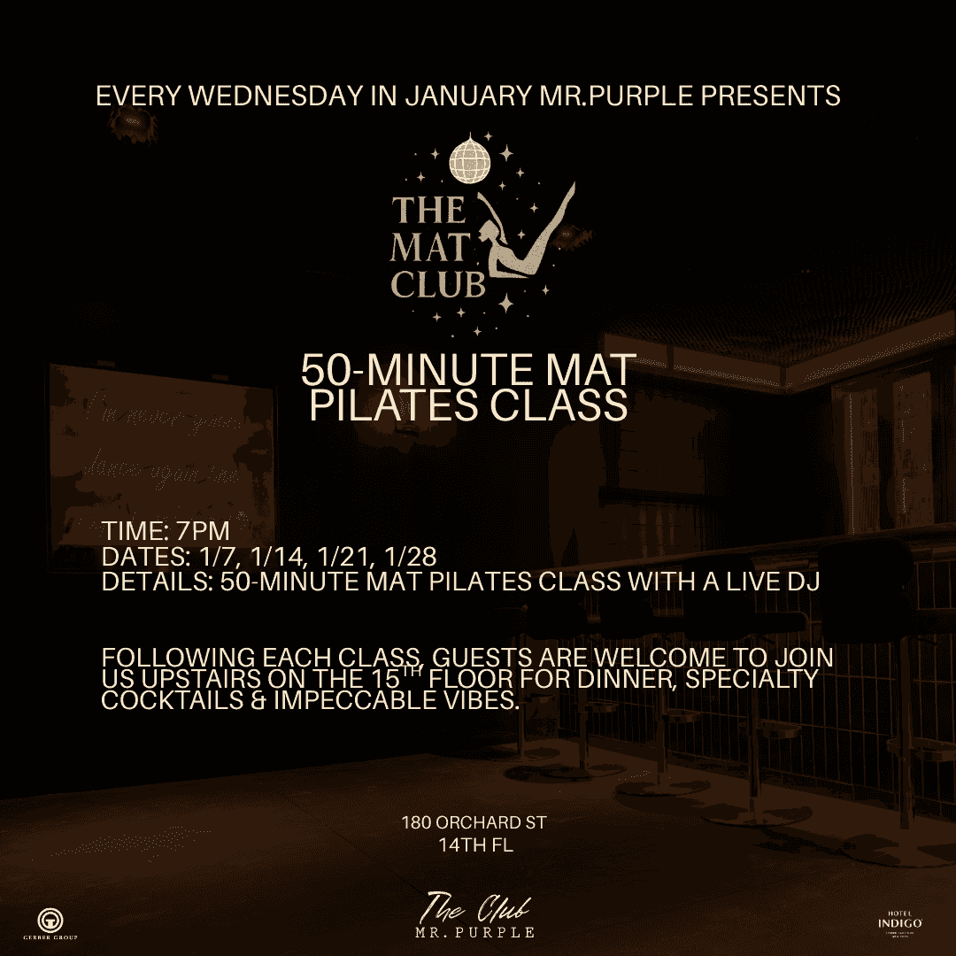 January 14th at Mr. Purple — a 50-minute flow in the club followed by dinner and drinks upstairs. Limited spots.