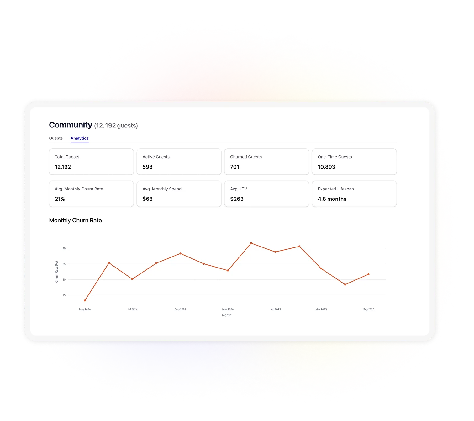 Live Subscriber Analytics: A smarter view of your community, updated in real time. See who's engaged, who's at risk of drifting, and how your guest base is evolving, so you can make confident decisions without digging through raw data.