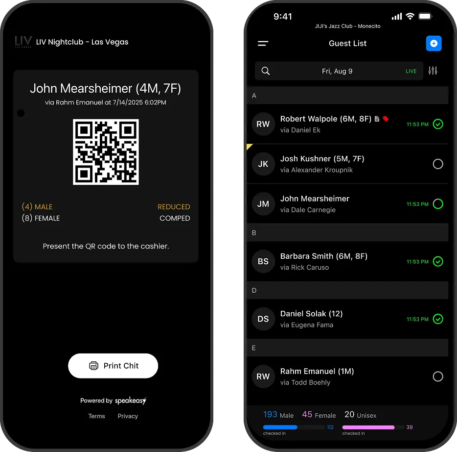 Staff use the Speakeasy Manager app to scan tickets. The app is available on the Apple App Store and Google Play Store.