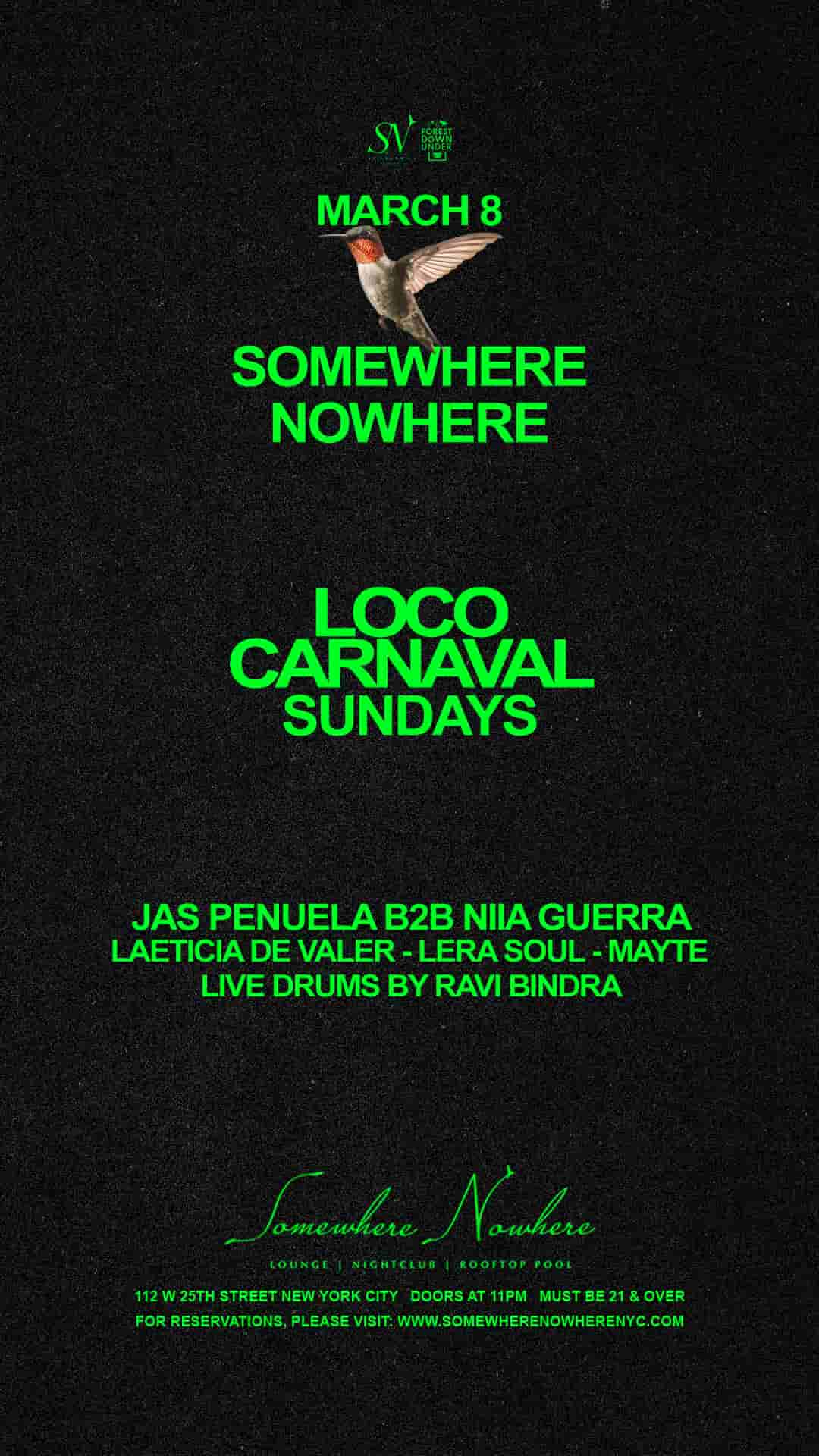 On Sunday, March 8th, Forest Döwn Under presents Loco Carnaval Sundays with music by Jas Penuela b2b Niia Guerra, Laeticia De Valer, Lera Soul and Mayte at Somewhere Nowhere NYC.