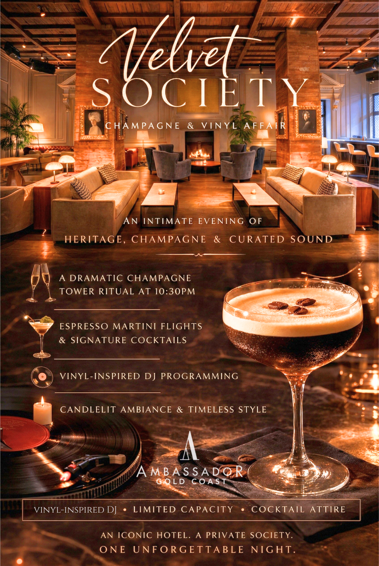 Velvet Society is a gathering for the discerning — where champagne glistens, vinyl hums softly, and the evening unfolds with effortless glamour.