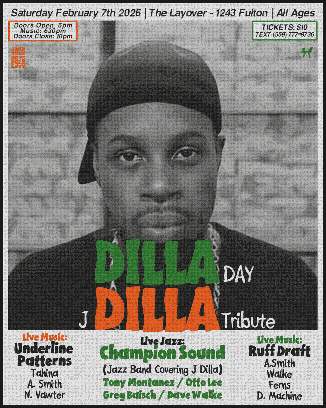 LIVE MUSIC FROM: *CHAMPION SOUND* A J Dilla Tribute Band. Performing Jazz *RUFF DRAFT* A J Dilla Tribute Band. *UNDERLINE PATTERNS* A solo project by Tahina. Paying tribute to Dilla